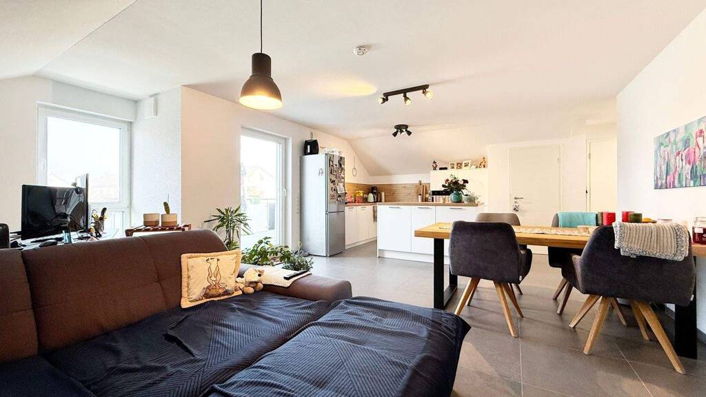 Diese hochwertige Dachgeschosswohnung befindet sich in einem modernen 4-Familienhaus in massiver Bauweise, das 2022 errichtet und 2023 bezugsfertig gestellt wurde. Die Immobilie überzeugt durch eine energiesparende Bauweise nach KfW-55-Standard sowie durch ein zeitgemäßes, nachhaltiges Energiekonzept. Die Beheizung des Hauses erfolgt über eine moderne Luft-Wasser-Wärmepumpe. Die Wohnung verfügt über eine Wohnfläche von ca. 99,92 m² und bietet mit 3,5 Zimmern großzügige Platzverhältnisse. Herzstück ist der offen gestaltete Wohn- und Essbereich mit offener Küche und Zugang zum großzügigen, überdachten Südwestbalkon. Die vorhandene Einbauküche gehört den Mietern. Neben dem Schlafzimmer steht ein weiteres Kinder- oder Arbeitszimmer zur Verfügung. Das modern ausgestattete Badezimmer bietet eine bodenebene Dusche, eine Badewanne, einen Waschmaschinenanschluss, WC sowie ein Waschbecken mit Spiegel und Unterschrank. Ergänzt wird das Raumangebot durch ein separates Gäste-WC sowie einen praktischen Abstellraum innerhalb der Wohnung. Zusätzlich steht der Wohnung ein Dachboden mit zusätzlichem Stauraum zur Verfügung, der über eine Einschubtreppe innerhalb der Wohnung begehbar ist. Die Ausstattung erfüllt hohe Ansprüche: Fußbodenheizung mit digitaler Einzelraumsteuerung, elektrische Rollläden in allen Räumen, LAN-/Netzwerkdosen, TV-Anschlüsse in allen Wohn- und Schlafräumen sowie eine kontrollierte, dezentrale Be- und Entlüftungsanlage sorgen für zeitgemäßen Wohnkomfort. Hochwertige Materialien wie Edelputz-Wandbeläge, elegante Lack-Innentüren, Sanitärobjekte von Villeroy & Boch und Armaturen von Hansgrohe unterstreichen den gehobenen Standard. Zur Wohnung gehören ein großzügiger Kellerraum sowie ein Außenstellplatz. Ein Hausmeisterservice und eine professionelle Hausverwaltung gewährleisten eine komfortable Betreuung der Immobilie. Das Treppenhaus ist mit stilvollen Granitbelägen ausgestattet. Die Wohnung ist derzeit vermietet. Die zentrumsnahe und dennoch ruhige Lage in der Hohlehrenstraße in VS-Schwenningen rundet dieses attraktive Angebot ab. Haben wir Ihr Interesse geweckt? Gerne lassen wir Ihnen ein ausführliches Exposé zukommen und freuen uns, Ihnen die Immobilie bei einem persönlichen Besichtigungstermin vorzustellen