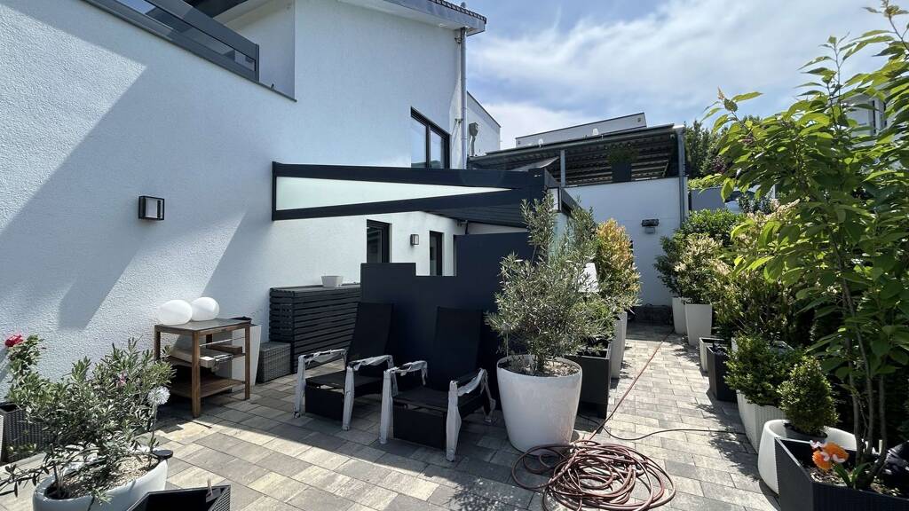 Im Gartengeschoss befinden sich die privaten Rückzugsorte der Familie: ein großzügiges Schlafzimmer mit direktem Zugang zur teilüberdachten Terrasse mit Glasdach und in den Garten, ein weiteres flexibel nutzbarer Raum - ideal als Kinderzimmer, Homeoffice oder Gästezimmer - sowie ein geschmackvoll ausgestattetes Badezimmer mit begehbarer Dusche und hochwertigen Armaturen. Auch auf dieser Ebene sorgt die Kombination aus Design und Funktionalität für höchsten Wohnkomfort. Eine große, zweite überdachte Terrasse im unteren Bereich eröffnet zusätzliche Nutzungsmöglichkeiten und bietet direkten Zugang zur liebevoll gestalteten Gartenfläche.