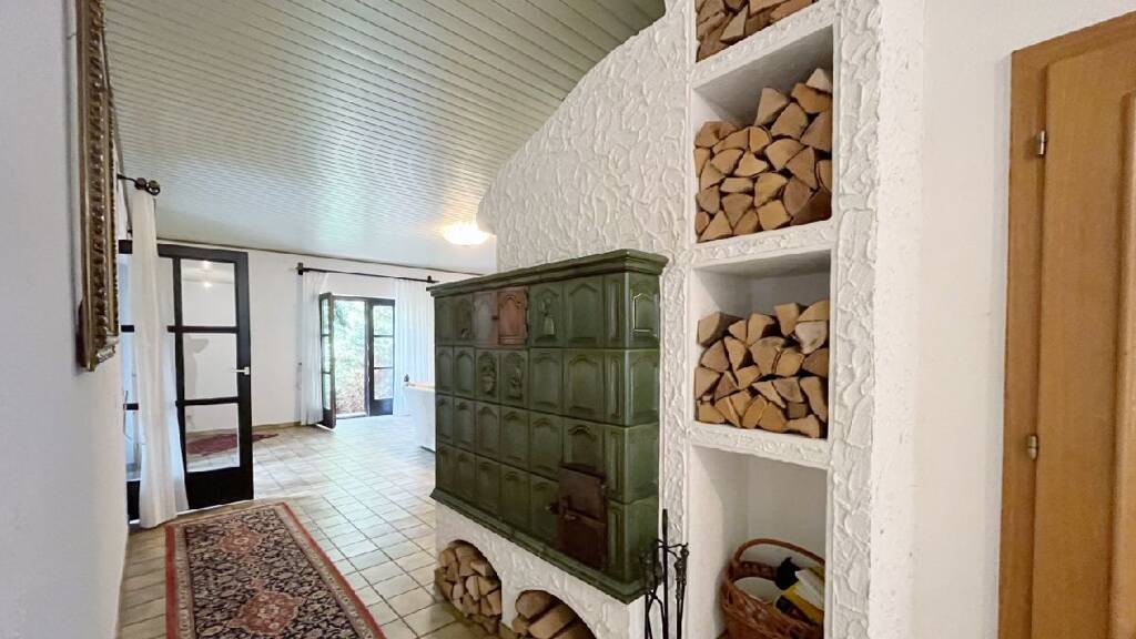 Vorbei an einem sehr schönen Kachelofen gelangen Sie in den Wohnbereich, wo zwei Ausgänge auf die Terrasse eine perfekte Verbindung zwischen Innen- und Außenbereich schaffen. Ein weiteres Schlafzimmer sowie ein Badezimmer vervollständigen das Erdgeschoss.