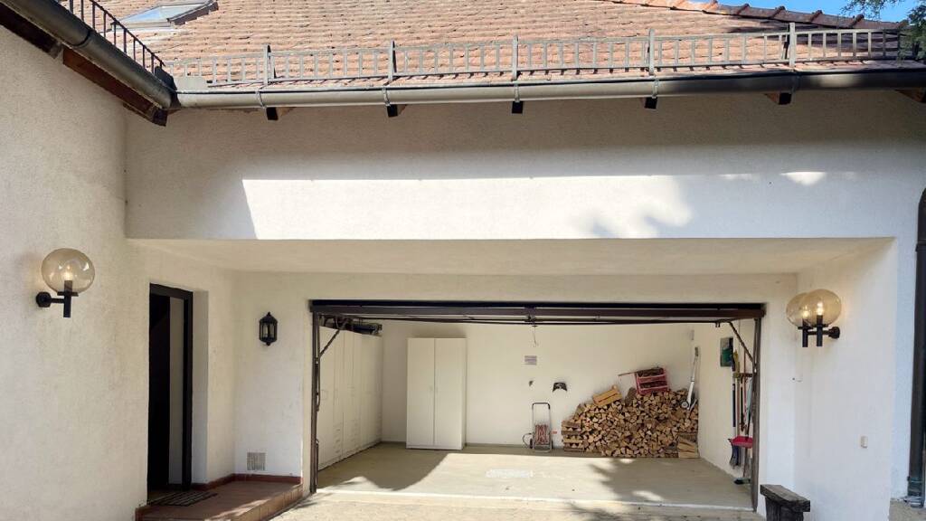 Die Garage für zwei Pkw verfügt über ein automatisches Garagentor, während zusätzlich Abstellplatz für weitere Fahrzeuge zur Verfügung stehen.