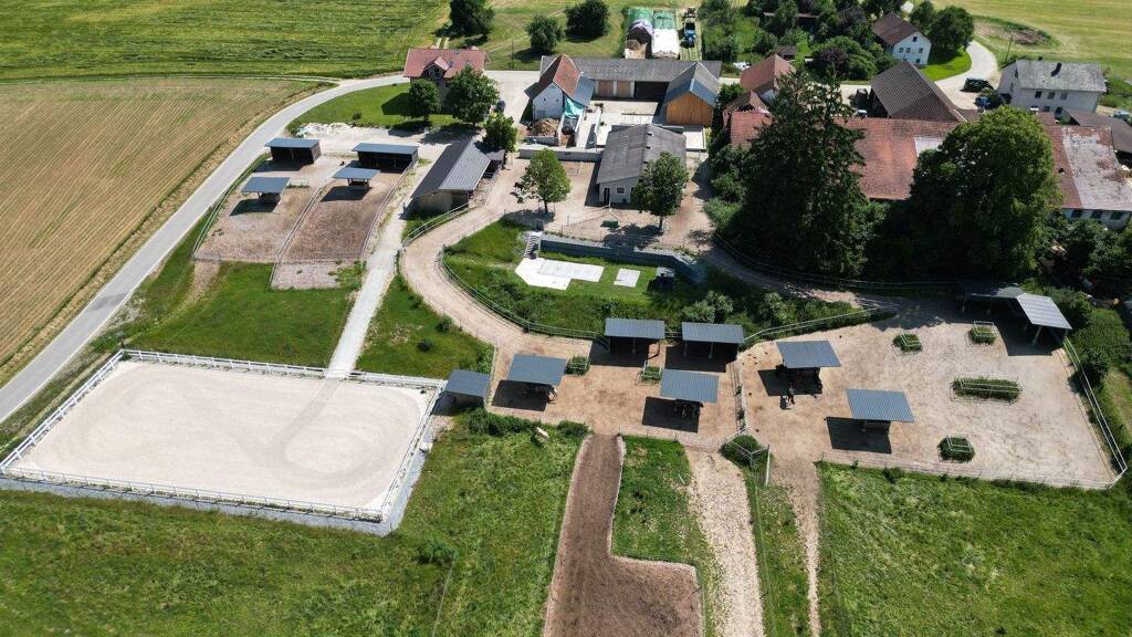Der angrenzende, ehemalige Vierseithof wurde in den letzten Jahren umfassend modernisiert und auf die artgerechte, effiziente Pferdehaltung ausgerichtet. Das Herzstück bildet der großzügige HIT-Offenstall, erbaut 2022, mit Platz für bis zu 32 Pferde, aktuell aufgeteilt in zwei Herden: Stuten und Wallache. Zusätzlich gibt es zwei kleinere Gruppen für Senioren- und Reheherde mit weiteren 8-10 Plätzen.