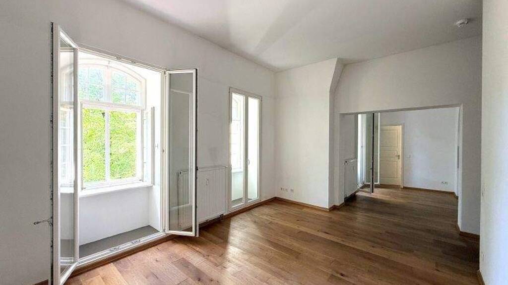 Attraktive, hochwertig ausgestattete Wohnung im 2.Obergeschoß (Mansardengeschoss): - moderner Grundriss - offenes Wohnen - hohe Räume (ca. 3 m) - geräumiges Wohnzimmer - Küche mit moderner Einbauküche - hochwertig gefliestes Badezimmer mit Dusche - Waschmaschinenanschluss im Bad - Echtholzdielen in den Wohnräumen