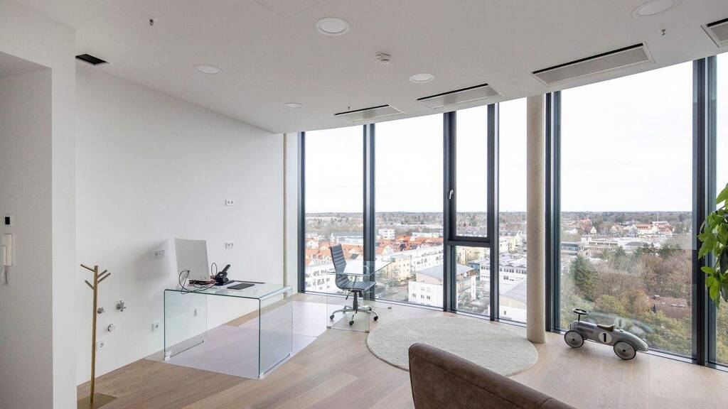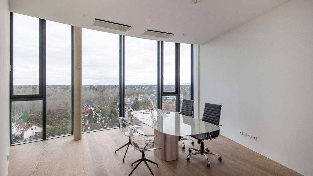 THE VIEW: Neues Wahrzeichen Ottobrunns: Mit einer Höhe von 40,5 Metern und 4.200 qm Bruttomietfläche, verteilt auf elf Etagen überragt der neue Turm ganz Ottobrunn. Zeitgenössische Architektur wird verbunden mit modernen Impulsen. Der neue Turm ist Teil eines Gesamt-Ensemble von 7 Gebäuden THE VIEW.
