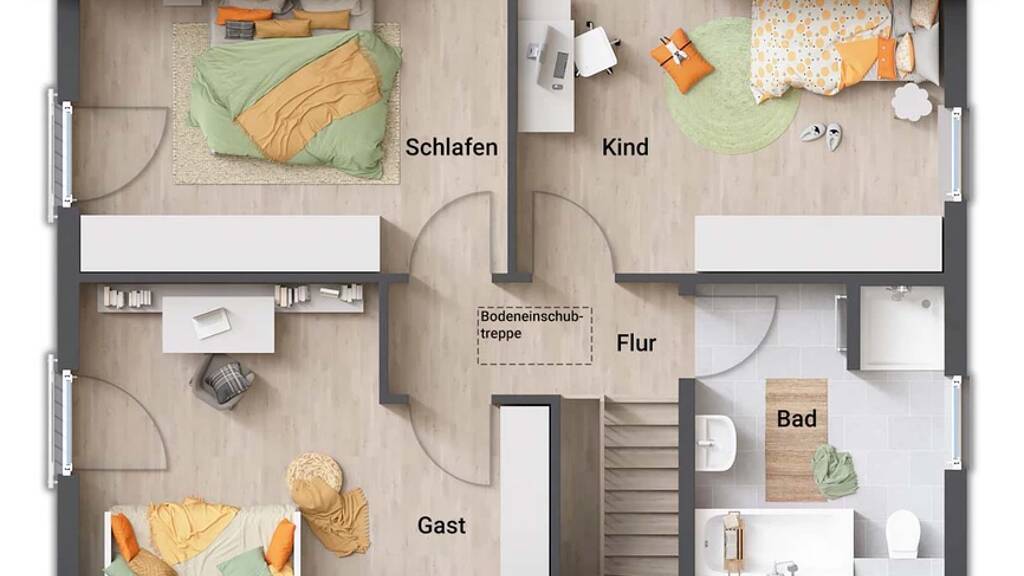 Auch die Küche bietet Ihnen viel Platz für das gemeinsame Kochen mit den Kindern oder Freunden. Die drei geräumigen Zimmer im Obergeschoss bieten genug Platz zur persönlichen Entfaltung, eine weitere Unterteilung dieser Etage ist möglich. Dieses Haus besitzt nicht nur Charakter und einen besonderen Charme, es ist obendrein äußerst flexibel. Für große Familien können 5 oder 6 Zimmer eingeplant werden. Auch das Hausdesign ist wandlungsfähig: ob modern oder im süddeutschen Stil – im Flair werden Ihre Familie und Sie sich wohlfühlen.