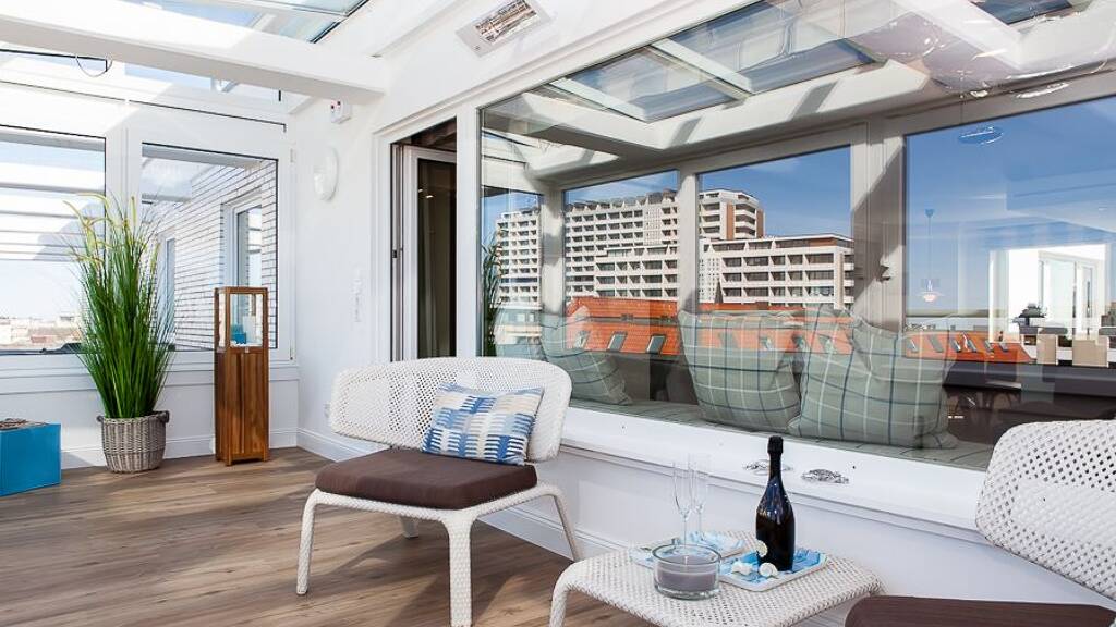 Objektbeschreibung Ein Penthouse der Extraklasse erwartet Sie im "Dünenburg", einem modernen Apartmenthaus in bester Lage. Mit bis zu 6 Personen genießen Sie moderne Eleganz unweit des Badestrands und erleben das Spiel der Wolken über der Nordsee auf ihrer Dachterrasse oder im geschützten Wintergarten. Das Objekt wurde vor ca. 12 Jahren kernsaniert und bietet Platz auch für die Großfamilie.
