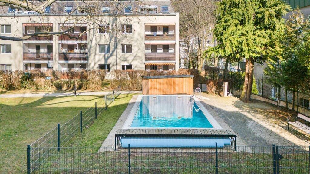 Die Fassade verfügt über einen Vollwärmeschutz, und zwischenzeitlich wurden die Fenster erneuert. Gemeinschaftlich nutzbare Annehmlichkeiten wie ein Pool, ein Waschraum und ein Raum mit Sauna ergänzen den Wohnkomfort.