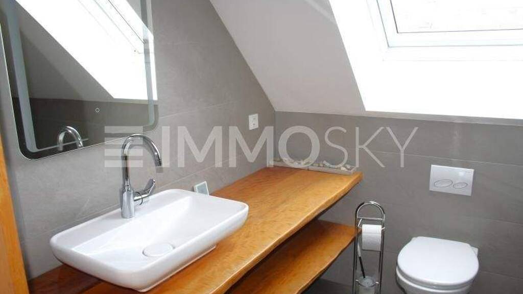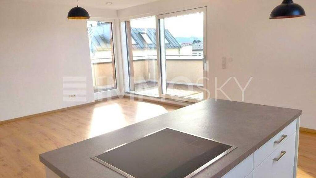 Dieses neuwertige und zeitlose Eigenheim, in einem erst 2015 erbautem Wohnhaus mit lediglich 3 Parteien, wovon jede Wohneinheit in einer Etage angesiedelt ist und Sie Ihr Glück in der obersten, 2.Etage ( Dachgeschoß) vorfinden. Der Nachteil dass dieses bezaubernde Zuhause über keinen Lift verfügt, läßt sich dennoch aufgrund der Lage und lichtdurchfluteter Ausrichtung allemal wett machen. Raumaufteilung:1 Wonh-Esszimmer von knapp 35 m2 mit eleganter Küche samt Markengeräten, Apothekerschrank und offener Herdstelle, sowie Zugang auf die mit elektrischer Sonnenmarkise und Wasseranschluss ausgestattete, südwestlich ausgerichtete Dachterrasse von knapp 20 m2. Herrliche Sonnenuntergänge in trauter Zweisamkeit bei einem Glas Wein könnte Ihr täglicher Begleiter sein.
