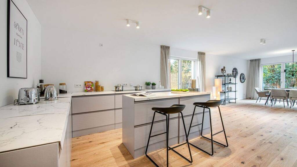 Ein intelligenter Grundriss und familiengerecht geschnittene Räume prägen dieses anspruchsvolle Objekt mit Haus-im-Haus-Charakter. Dank der perfekten Ausrichtung nach Osten, Süden und Westen gewinnen die Räume von morgens bis abends viel Licht und Sonne. Die Räumlichkeiten erstrecken sich über ca. 162 m². Eine Diele mit Garderobenmöglichkeit bildet einen freundlichen Empfang. Das Herzstück dieses Familiendomizils ist ein Wohn-/Essbereich mit offener Küche; auch Anschlüsse für eine Kochinsel werden vorbereitet. Atemberaubende Glasfronten geben den Blick nach Süden und Westen frei und stellen die Verbindung zu einer weitläufigen Sonnenterrasse her. Hinzu kommen drei flexibel nutzbare Schlafzimmer sowie zwei Bäder. Ein weitläufiger Privatgarten mit sonniger Terrasse rahmt die barrierefreie Wohnung an allen drei Seiten und bildet eine herrliche Outdoor-Oase zum Entspannen, Spielen, Grillen und Feiern.