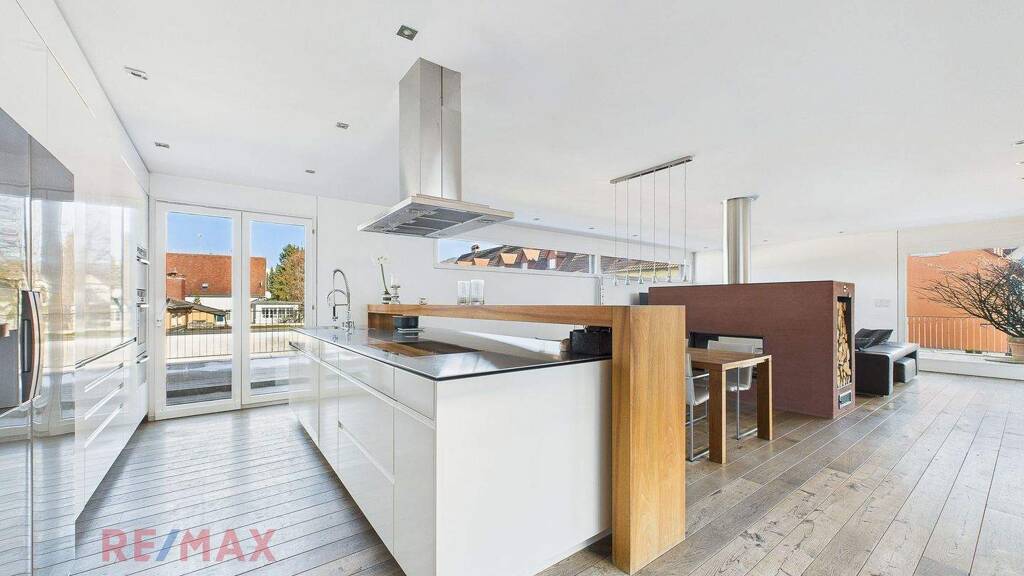 Ein Highlight ist der elegante Ofen, der für Wärme und eine angenehme Raumaufteilung sorgt, sowie die hochwertige Küche mit großzügiger Insel und integriertem Barbereich.