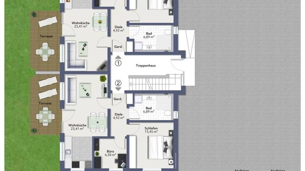 Wir freuen uns, ihnen dieses Neubau-6-Familienhaus KFW 55 ( GEG 2024 Standard Energiehaus) in Taufkirchen/Vils anbieten zu können. Auf jeder Etage EG und 1. OG erstrecken sich zwei 2,5 -Zimmerwohnungen mit einer Wohnküche, einem Büro, einem Schlafzimmer, das Badezimmer und jeweils einem West - Balkon beziehungsweise einer West - Terrasse. Im Dachgeschoss entstehen zwei 2 - Zimmerwohnungen Die Bäder sind mit einer Dusche, dem WC, ein Waschbecken, einem Waschmaschinenanschluss und einem Fenster ausgestattet. Im Kellergeschoss befinden sich 6 Kellerräume, ein Fahrradabstellraum sowie dem Heiz- und Technikraum. Zum Abstellen der Fahrzeuge sind vor dem Gebäude großzügige Stellplätze vorhanden.