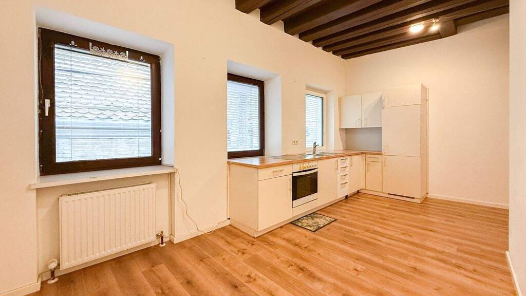 Der Wohn-/Essbereich mit integrierter Einbauküche lässt sich flexibel einrichten und bietet trotz kompakter Größe ein angenehmes Raumgefühl.