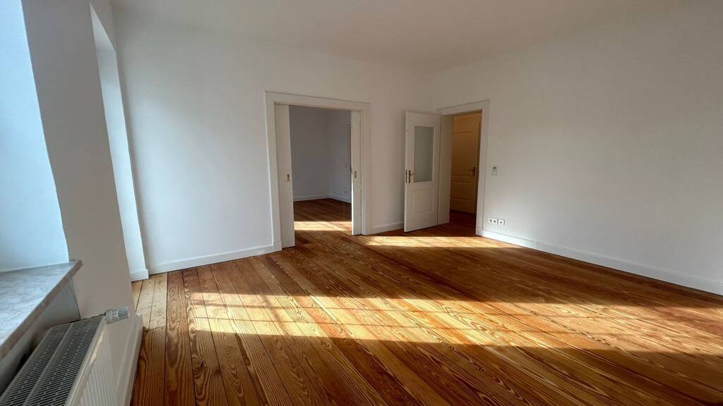 Die Wohnfläche von etwa 89 m² verteilt sich auf vier großzügige Räume mit angenehmer Helligkeit und klassischem Altbaucharakter. Typische Merkmale wie hohe Decken, ansprechende Raumproportionen und ein Dielenboden sorgen für ein besonderes Wohnambiente.