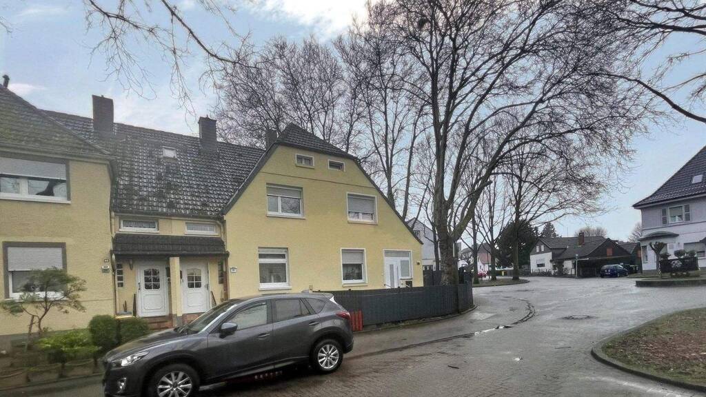 Dieses Reihenmittelhaus befindet sich in einer ruhigen Spielstraße in Dortmund-Derne, eingebettet in die ortstypische Zechenhausbebauung mit alten Baumbestand am Straßenrand.