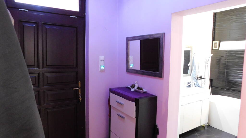 Das Badezimmer verfügt über eine Badewanne und ein WC. Zusätzlich gibt es eine separate Dusche, ein weiteres WC sowie einen Waschmaschinenanschluss. Die Küche ist mit hochwertigen Einbaumöbeln und integrierten Geräten ausgestattet. Ein Tageslichtrohr bringt zusätzliches natürliches Licht in den Raum. Das helle Wohnzimmer bietet durch große Glasflächen eine traumhafte Aussicht auf die etwa 20 m² große Terrasse und den Garten.