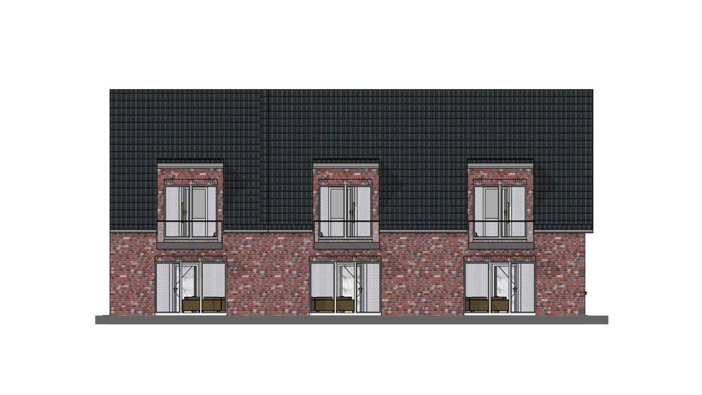 Haus 2: Die drei Reihenhäuser überzeugen mit identischen Grundrissen und einer Wohnfläche von jeweils circa 99 m². Die Häuser bieten eine durchdachte Raumaufteilung und ein modernes Ambiente, das speziell auf die Bedürfnisse von Familien ausgerichtet ist. Große Fensterflächen, funktionale Wohnbereiche und private Außenflächen scha?en eine Wohlfühlatmosphäre.