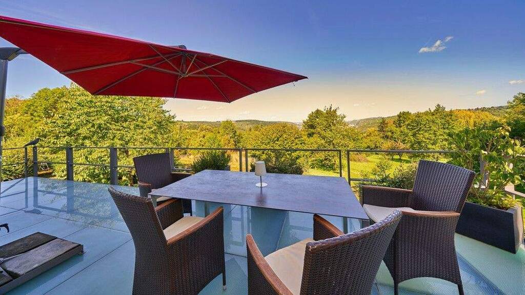 Bodentiefe Fenster im Wohn- und Essbereich eröffnen einen traumhaften Blick ins Neckartal. Der angrenzende Balkon mit Glasboden lädt zu entspannten Stunden ein. Ein offener Kamin mit zweiseitiger Verglasung schafft eine behagliche Atmosphäre.