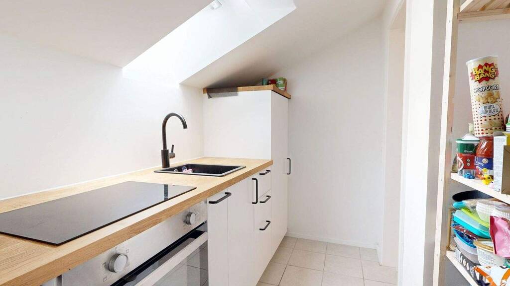 Das geräumige Wohnzimmer mit Laminatboden schafft ein einladendes Ambiente, während das Schlafzimmer als ruhiger Rückzugsort dient. Die moderne Einbauküche und das stilvolle Badezimmer mit Fliesenboden komplettieren das Angebot.
