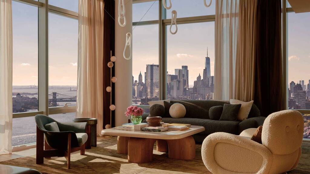 Die Annehmlichkeiten und Dienstleistungen im 1DSQ sind unvergleichlich mit über 45.000 Quadratmetern sonnendurchfluteter Innenräume und Terrassen auf fünf Etagen, fast alle davon mit unaufhaltsamem Blick auf den Fluss. Der Innenpool im Freien verfügt über Bahnbahnen und Sitzbereiche in einem grünen Spa-Ambiente mit Whirlpool, kaltem Tauchbecken, Dampfbad, Sauna, Behandlungsräumen und einer ganzjährig geöffneten Loggia mit Blick auf die Freiheitsstatue. Ein zweiter beheizter Pool, dieser im Freien, verfügt über Sitzgelegenheiten im Resort-Stil auf einer Sonnenterrasse mit Liegestühlen, Essbereichen und Außenduschen. Das gut ausgestattete Fitnesscenter umfasst ein Yoga-Studio am Flussufer und ein hochintensives Trainingsstudio, in dem Kurse angeboten werden. Eine dritte parkähnliche Terrasse bietet intime Essnischen im Freien mit Grills, Außenküchen und Blick auf Midtown Manhattan. Ein Spielzimmer, ein Medienraum, ein Solarium und viel Platz zum Arbeiten von zu Hause aus nehmen einen Großteil der Club-Etage ein, wo die Eigentümer von Eigentumswohnungen auch Zugang zu privaten Speise- und Partyräumen am Wasser haben.