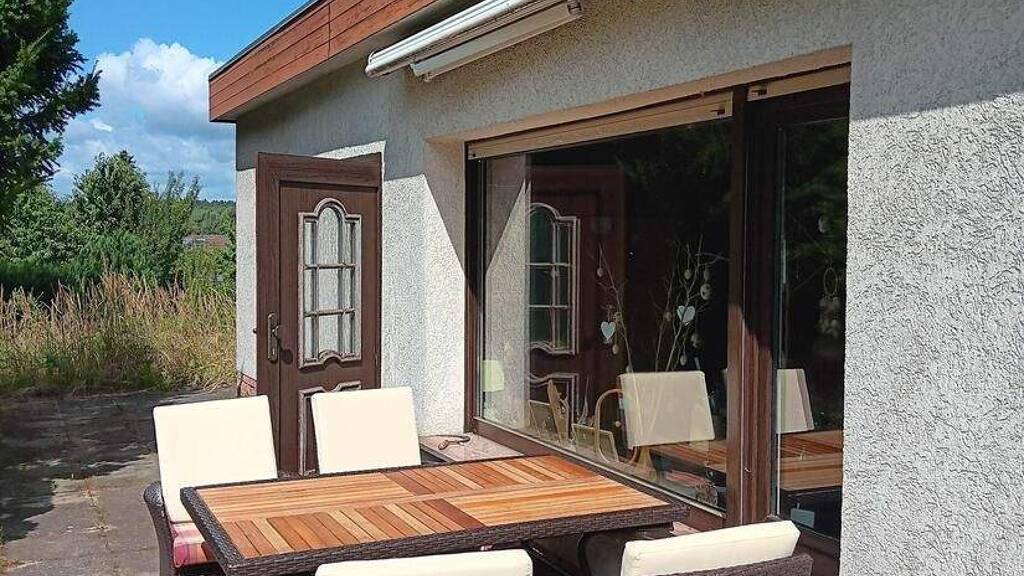 Das knapp 2.000 qm große Grundstück ist mit einem massiven Bungalow mit ca. 34 qm Wohn- und Nutzfläche bebaut, welcher Wohn- und Schlafzimmer, eine kleine Küche, das WC mit Dusche und Waschbecken und den Keller beherbergt. Eine Garage steht im nordwestlichen Teil des Anwesens.