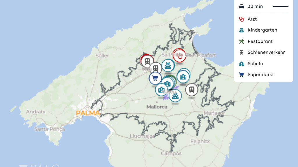 Die zentrale Lage im Inselinneren ermöglicht eine hervorragende Erreichbarkeit: Palma sowie die umliegenden Küstenregionen sind in kurzer Fahrzeit erreichbar. Gleichzeitig profitieren Bewohner von einer ruhigen, entspannten Umgebung mit hoher Privatsphäre.