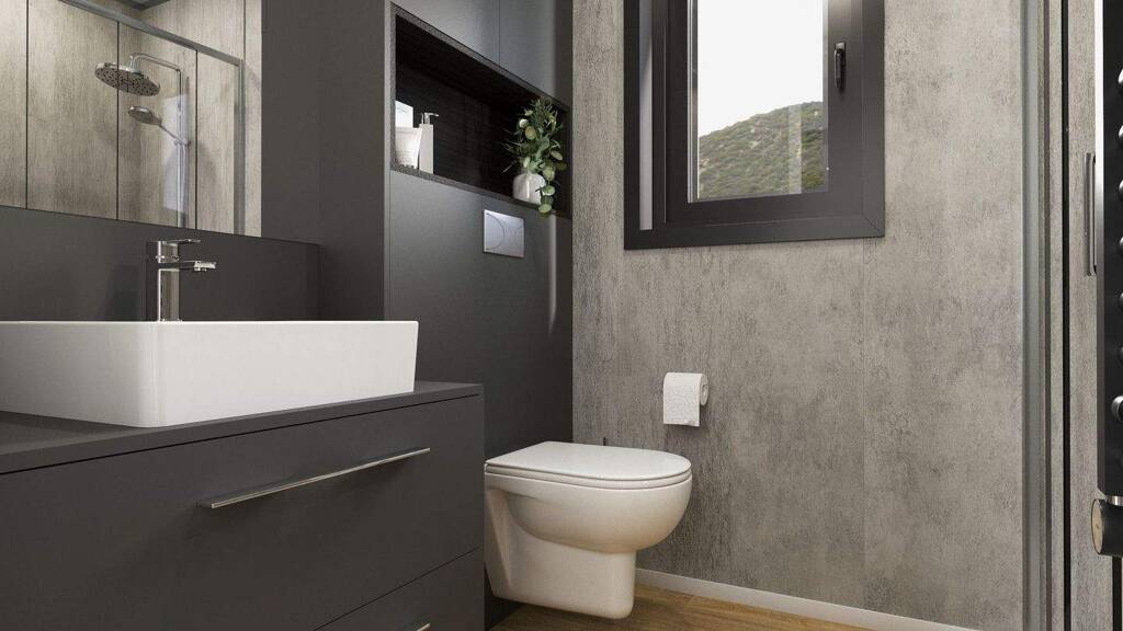 Dieses stilvolle Ferienhaus (8 m lang, 5,8 m breit und 3,4 m hoch) vermittelt bereits beim ersten Eindruck ein warmes Gefühl des Ankommens. Die moderne anthrazitfarbene Fassade in Kombination mit eleganten Holzoptik-Details fügt sich harmonisch in die natürliche, waldreiche Umgebung ein und unterstreicht den hochwertigen Charakter dieser 4-Personen-Unterkunft.