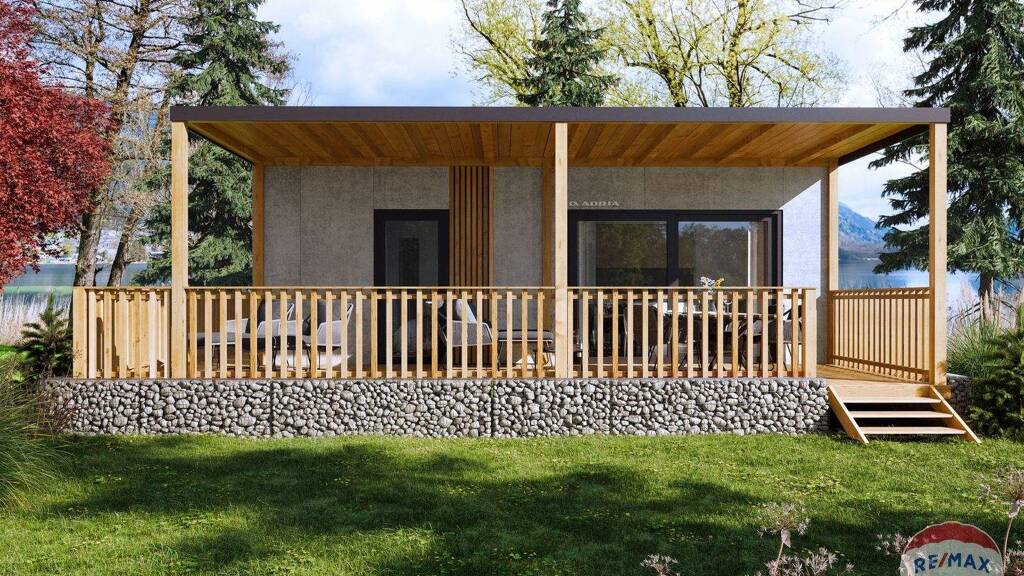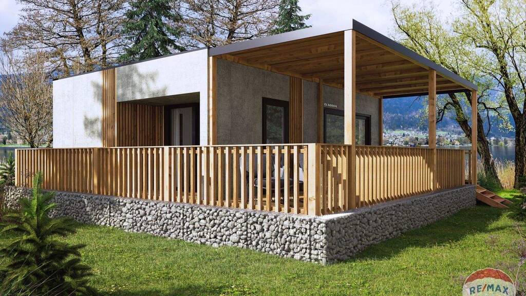 Dank der Schiebetüren gelangen Sie direkt aus dem hellen Wohnbereich auf die großzügige, umlaufende Terrasse. Diese ist aus imprägniertem Kiefernholz gefertigt - ebenso wie das dazu passende Geländer - und bietet einen atemberaubenden Blick über den Ossiacher See und die umliegenden Bergflanken. Die große Überdachung sorgt dafür, dass Sie hier in jeder Jahreszeit geschützt sitzen und genießen können.