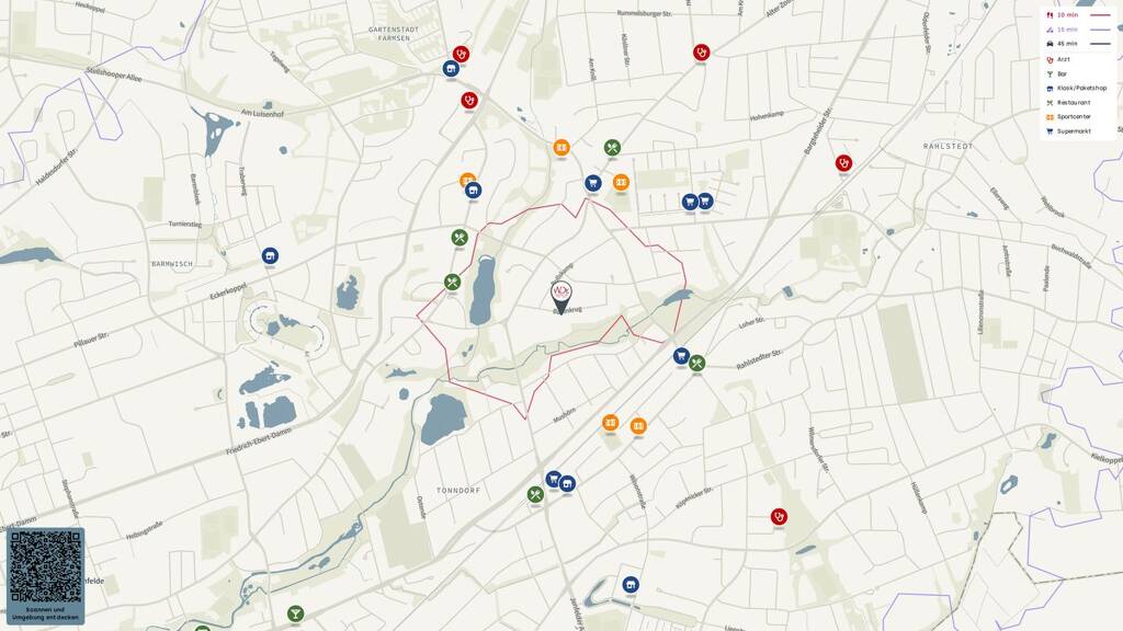 Willkommen im Barenkrug im Hamburger Stadtteil Farmsen-Berne der durch seine ruhige und zugleich sehr verkehrsgünstige Lage besticht. Inmitten eines grünen, familienfreundlichen Umfelds genießen Anwohner eine hohe Lebensqualität bei gleichzeitig hervorragender Anbindung an die Hamburger Innenstadt und die umliegenden Bezirke. Die Wohngegend zeichnet sich durch eine gut entwickelte Infrastruktur aus. In wenigen Minuten erreicht man zahlreiche Einkaufsmöglichkeiten, darunter Supermärkte, Discounter sowie Fachgeschäfte, die den Alltag bequem und unkompliziert gestalten. Ebenso finden sich in unmittelbarer Nähe diverse gastronomische Angebote und Cafés, die zu entspannten Stunden einladen. Für Familien ist die Lage besonders attraktiv, da sich zahlreiche Kindergärten, Schulen sowie Spielplätze in der Umgebung befinden. Auch die Anbindung an das öffentliche Verkehrsnetz könnte kaum besser sein: Der S-Bahnhof Rahlstedt ist nur einen kurzen Fußweg entfernt und bietet schnellen Zugang zu den zentralen Punkten Hamburgs. Die Autobahn A1 ist ebenfalls rasch erreichbar und sorgt für eine exzellente Anbindung an die Region. Die ruhige, grüne Umgebung der Straße Barenkrug lädt zu ausgedehnten Spaziergängen und Aktivitäten im Freien ein. Hier kombiniert sich urbanes Leben mit einem hohen Maß an Erholung und Natur.