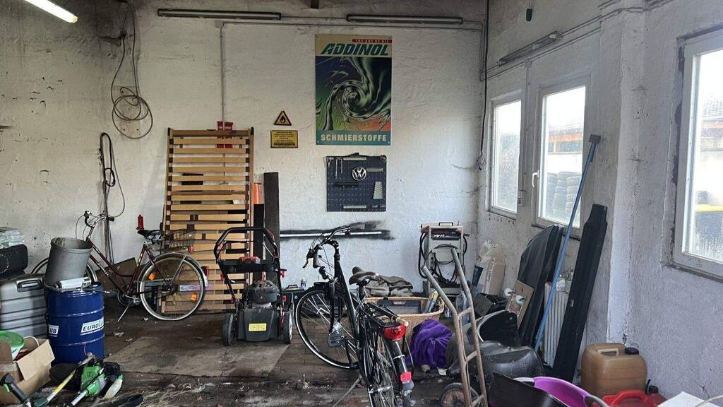 Gebäude & Ausstattung .Grundstücksgröße: ca. 1.330 m² .Nutzfläche Garagen/Werkstatt: ca. 122 m² .Baujahr: ca. 1976 .Dach Werkstatt-/Hallengebäude: erneuert im Jahr 2006 .Nebengebäude mit Büroflächen, Küche und Badezimmer mit Dusche .Büroeinrichtung teilweise vorhanden .Energieausweis liegt vor .Grundrisse vorhanden (werden nachgereicht)