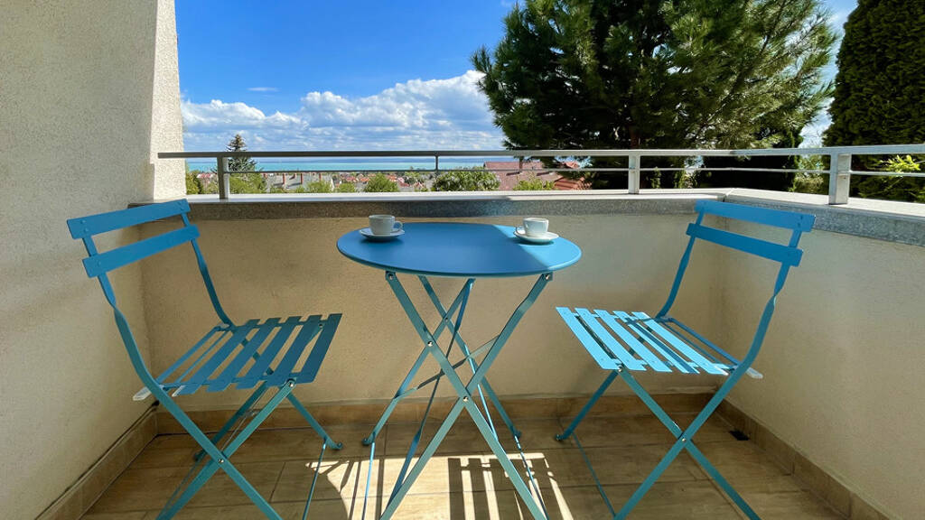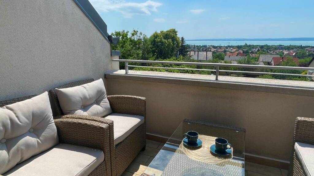 Im ersten Obergeschoss liegen drei weitere Apartments, alle mit Panoramablick auf den Balaton. Auch hier verfügen die Wohnungen über Wohn-/Essbereiche mit Küchenzeilen sowie moderne Bäder.
