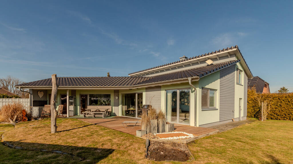 Sämtliche Zimmer haben dreifach verglaste Isolierfenster und von den nach Süden ausgerichteten Räumen im Erdgeschoss gelangt man durch Terrassentüren auf die teilweise überdachte große Holzterrasse (ca. 65 qm). Der in sich geschlossene Garten bietet ein Höchstmaß an Privatsphäre.