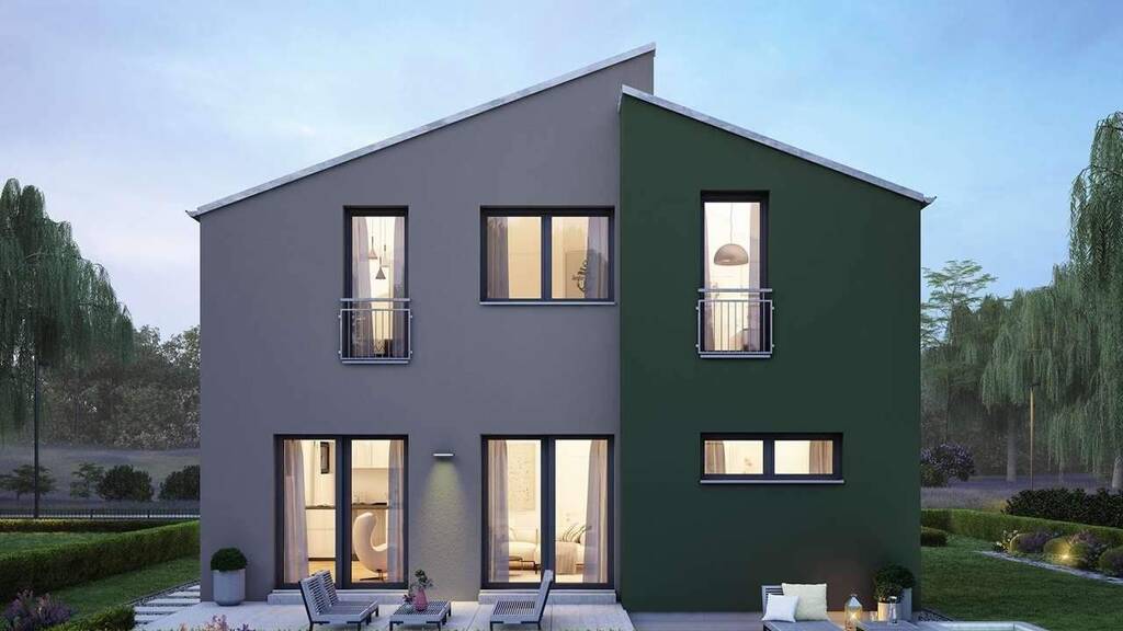 Dieses Einfamilienhaus bietet zwei leicht gegeneinander versetzte Baukörper mit Pultdächern und moderner Fassade. Im Erdgeschoss lenken große Fenstertüren im Wohn-Ess-Bereich den Blick nach draußen. Großzügig geschnittene Räume bieten viel Platz und viel Freiraum für eine individuelle Gestaltung.