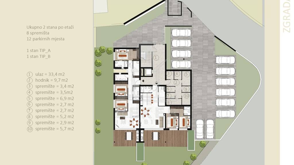 Das Neubauprojekt umfasst ein modernes Wohnhaus mit drei Etagen und insgesamt acht hochwertigen Apartments. Jede Einheit verfügt über einen privaten Abstellraum im Erdgeschoss sowie großzügige Terrassen, teils überdacht, teils offen, mit freiem Blick auf das Meer. Ein Aufzug verbindet alle Etagen. Private Parkplätze oder Garagen sorgen für Komfort und Sicherheit. Das Baukonzept setzt auf Energieeffizienz: Passivhäuser der Energieklasse A / A+, solide Bauweise und modernes Design schaffen ein angenehmes Zuhause.