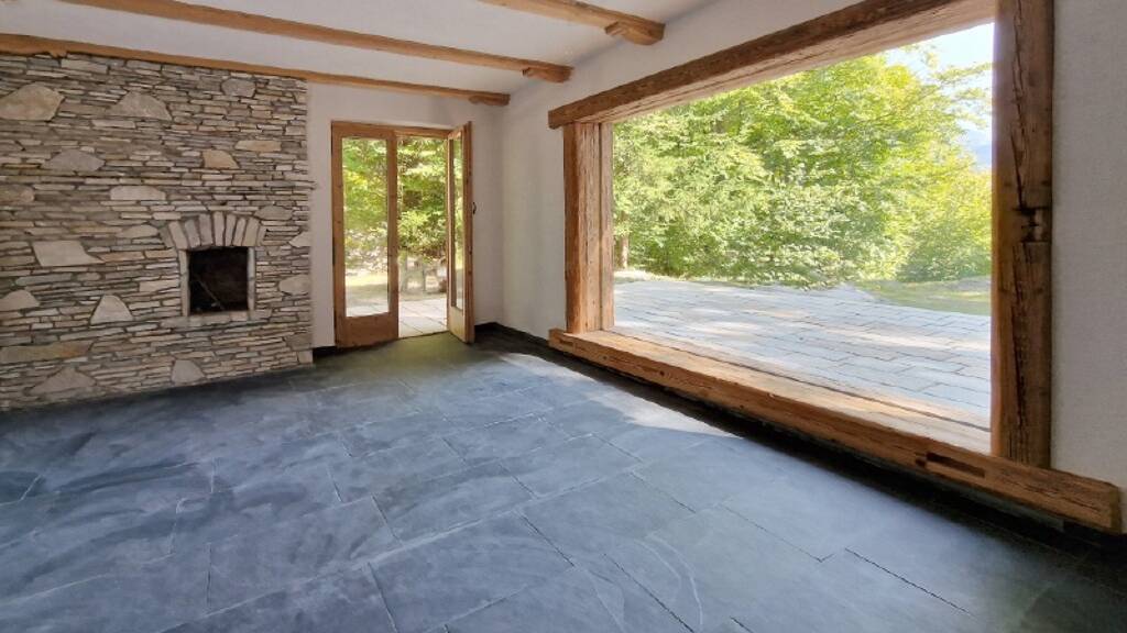 Wohnzimmer mit Essplatz, offenen Kamin und direkten Zugang auf die Terrasse