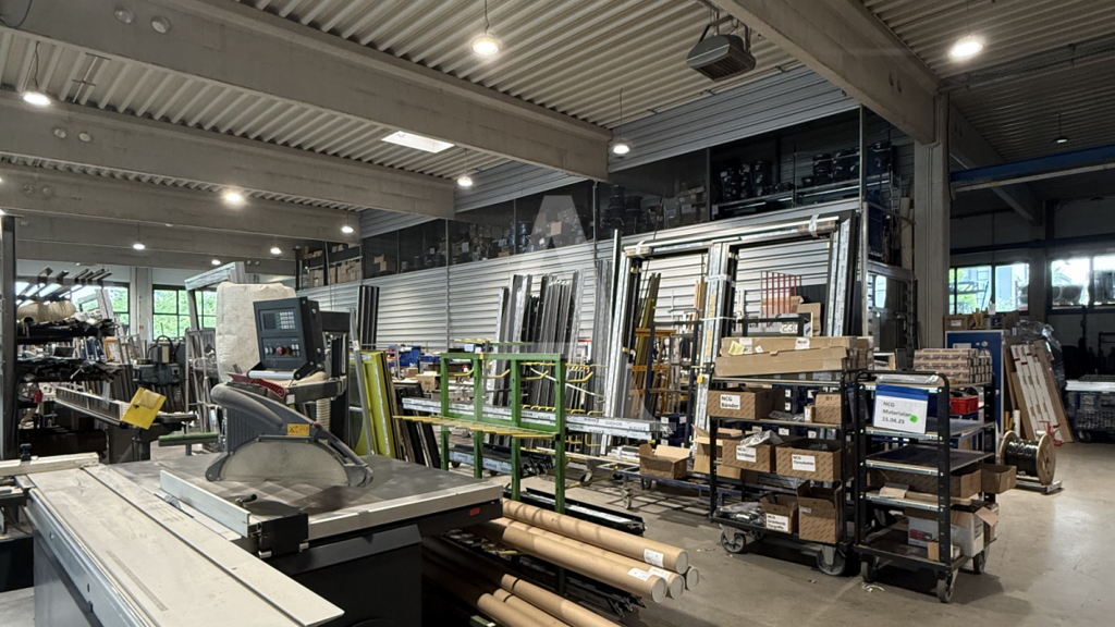 Das Büro ist modern und funktional gestaltet. Im Obergeschoss sind Bodenbeläge aus Industrieparkett verlegt, im Erdgeschoss kommen robuste Steinfliesen zum Einsatz. Es stehen geschlechtergetrennte Sanitärräume, Küchen- und Pausenräume sowie ein klimatisierter, beheizbarer Umkleideraum zur Verfügung. Ein Waschraum mit Warm- und Kaltwasser rundet das Angebot ab.