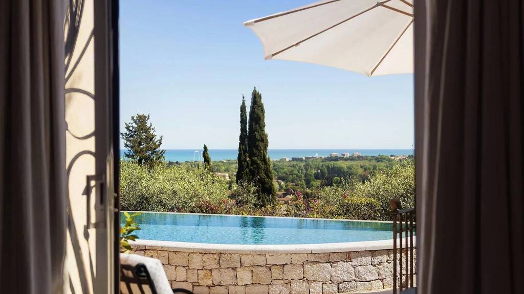 Unique property enjoying a panoramic view located in the heart of the old village of Biot nestled in the heart of a lush garden with swimming pool.