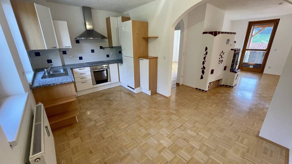 Weiterführend kommt man in das gemütliche Wohnzimmer - hier befindet sich auch der Kachelofen welcher mit Holz geheizt werden kann. Die Essküche mit voll ausgestatteter Küche bietet ausreichend Raum für Hobbyköche.