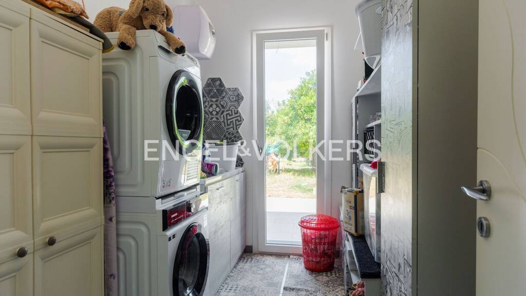 Das Erdgeschoss empfängt mit einem großen Eingang, der zu einem hellen, geräumigen Wohnbereich führt, perfekt für Momente mit Familie oder Freunden. Die Küche ist wohnlich und komplett ausgestattet, bereit zum Leben. Ein bequemes Arbeitszimmer, ein Gäste-WC und eine Waschküche vervollständigen das Stockwerk.