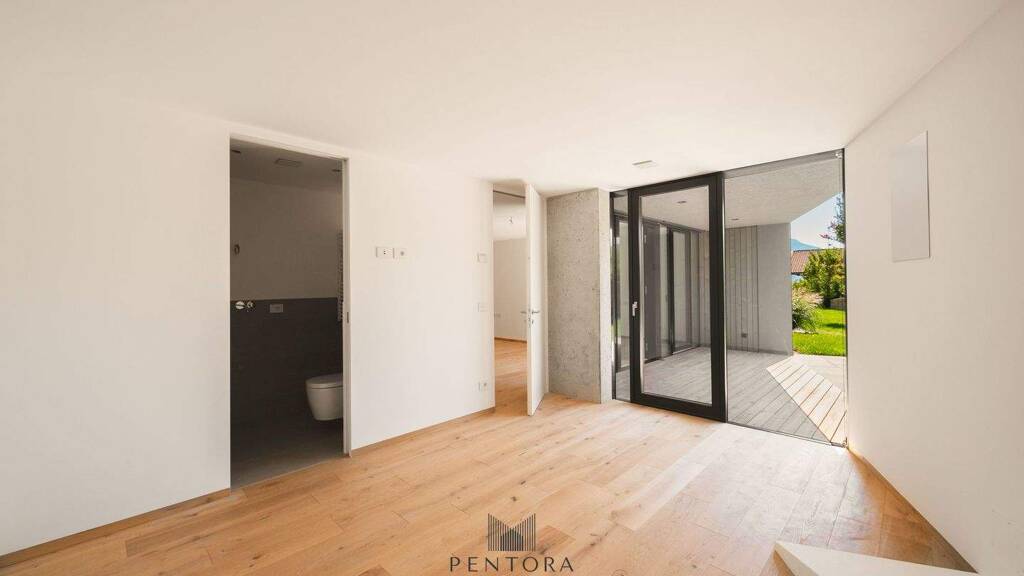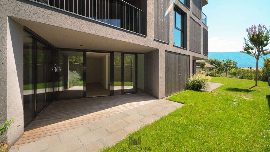 Die Lage der Immobilie ist zentral und bietet einen atemberaubenden Blick auf die umliegenden Alpen sowie auf die Stadt Meran. Große, rahmenlose Glaselemente sorgen für eine nahtlose Verbindung zwischen Innen- und Außenbereichen und lassen viel Tageslicht herein.