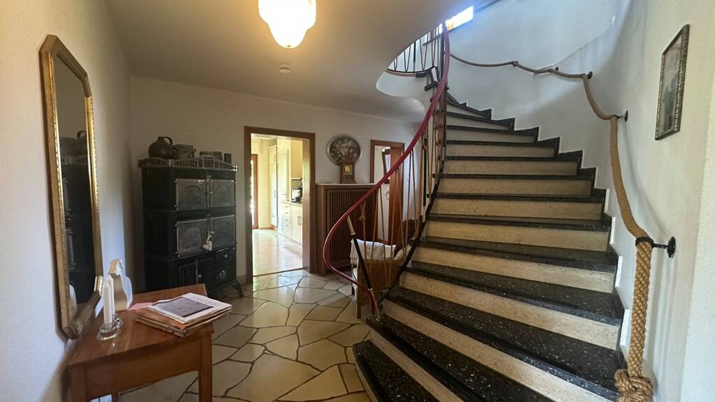 Eine elegante Treppe führt ins Obergeschoss, wo sich sechs weitere Zimmer befinden. Drei dieser Räume bieten Zugang zu einem Balkon mit Blick ins Grüne. Die gesamte Immobilie besticht durch eine stilvolle Kombination aus modernem Komfort und klassisch-antiquem Charme. Große Fensterflächen sorgen für viel Tageslicht und eine freundliche Wohnatmosphäre.