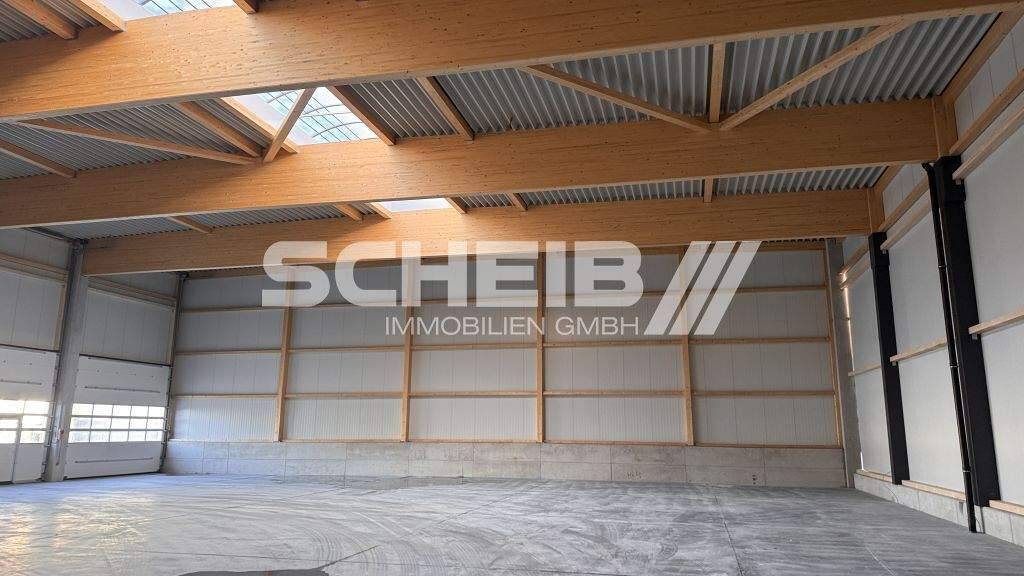 freigespannte Holzleimbinderkonstruktion: Breite 29,56 m x Länge 27,90 m - massiver Betonboden, Hubwagen Gabelstapler befahrbar - umlaufender Betonsockel - Außenwände wärmegedämmt - Raumhöhe Unterkante Leimbinder 7,47 m und Raumhöhe Unterkante Trapezblech an der Traufe 8,84 m - Zugang über 2 große Sektionaltore 5,12 m Breite x 4,50 m Höhe - großzügiger gepflasterter, eingezäunter Hof mit Tor