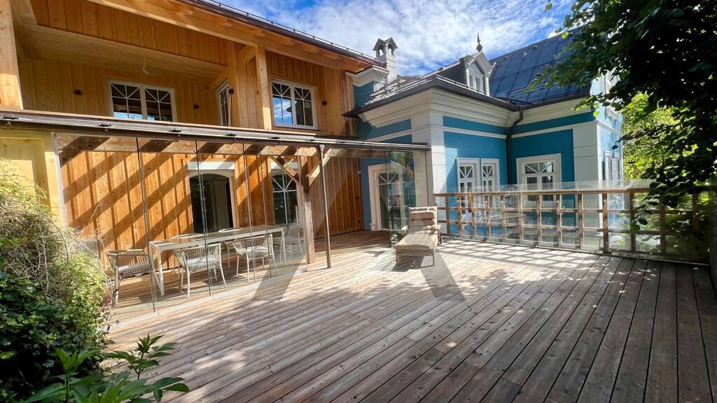 - Einbauküche mit Holzkasettendecke - Holzböden - hochwertige Tischlereinbauten - Wellnessbereich mit privatem Hallenbad, Sauna, Infrarotkabine - großzügige Terrasse - überdachter Stellplatz und freier Stellplatz - Möblierung wie im Exposé - Abstell-/Lagerraum ca. 12 m² - Lift