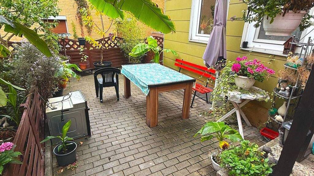 Die Wohnungen im Obergeschoss 58m² und 36m² teilen sich in Absprache mit der Wohnung im Erdgeschoss die zweite Terrasse (Eingangsbereich).