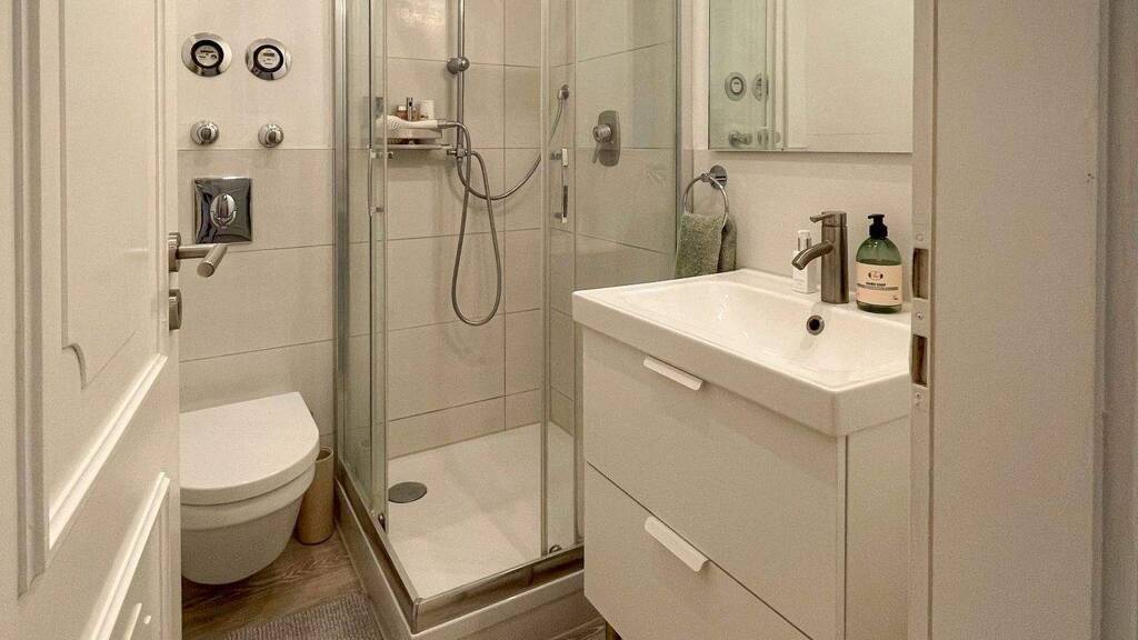 Das gepflegte Duschbad ist hell und funktional gestaltet. Ein zusätzlicher Kellerraum sorgt für praktischen Stauraum und schafft Ordnung im Wohnalltag.