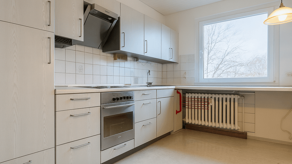 Die KĂĽche verfĂĽgt ĂĽber eine funktionale Raumaufteilung und bietet ausreichend Platz fĂĽr eine individuelle Gestaltung.