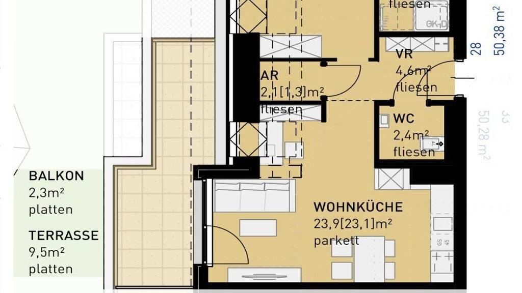 Stichworte Nutzfläche: 50,30 m², Gesamtfläche: 53,83 m², Anzahl Balkone: 1, Anzahl Terrassen: 1, Balkon-Terrassen-Fläche: 11,80 m², Kellerfläche: 2,10 m², Bundesland: Wien, 4 Etagen, Wohnungsnr.: 28