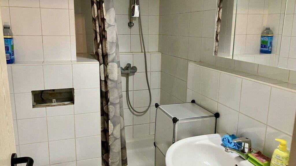 Das weiĂź geflieste Bad ist mit einer Dusche, einem Waschbecken und einem WC ausgestattet. Es ist funktional gestaltet.