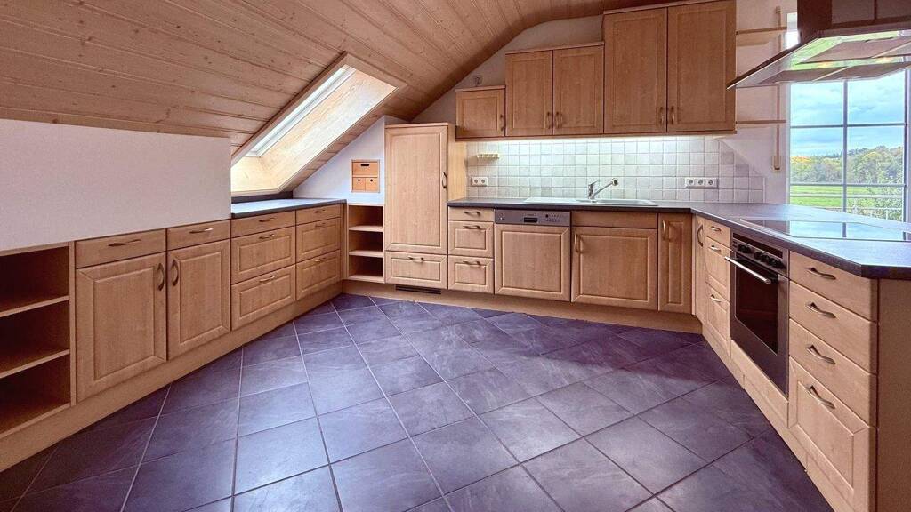 Diese helle Wohnung wurde 1999 in Massivbauweise in ruhiger Ortsrandlage erbaut. Das Haus hat eine Grundstücksfläche von 1166 m², davon ist die Hälfte der Dachgeschosswohnung zugeteilt.