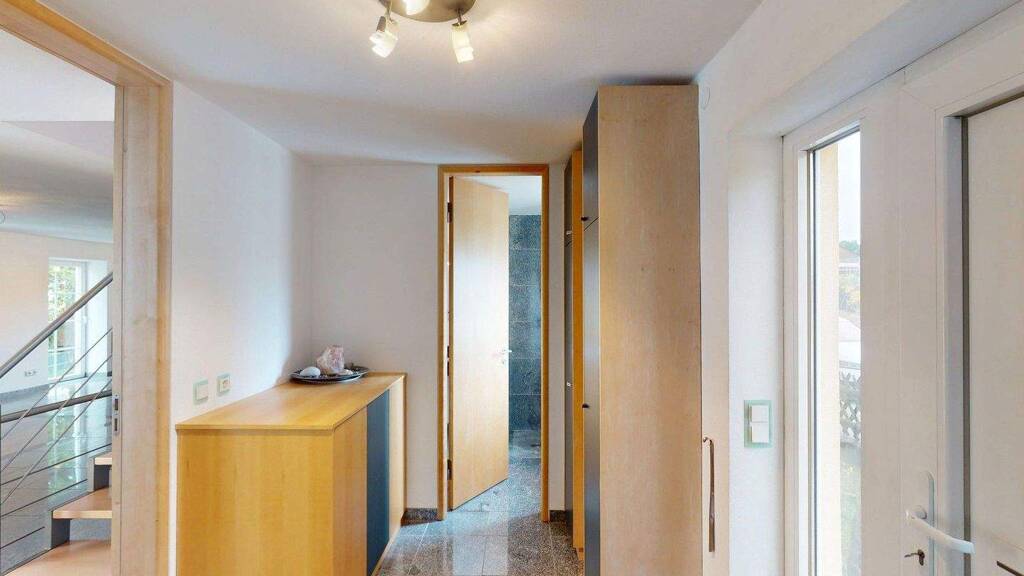 Insgesamt stehen sieben Räume zur Verfügung: ein Wohn- und Essbereich sowie sechs weitere, separat angeordnete Räume. Diese wurden bisher unter anderem als Büro, Massagezimmer, Ankleide, Schlafzimmer und Hauswirtschaftsraum genutzt. Das Dachgeschoss bietet einen großen Raum, der früher als Jugendzimmer genutzt wurde und sich ebenso für andere Nutzungen eignet.
