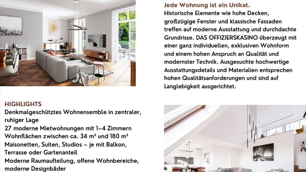 Hier trifft Geschichte auf Gegenwart: Das denkmalgeschützte Gebäude aus der wilhelminischen Zeit wurde aufwendig saniert und bietet modernen Wohnkomfort mit einzigartigem Charakter. Extravagante Wünsche werden in den Suiten mit Galerien, Lufträumen oder unter dem Säulenpavillon erfüllt. Alle Wohnungen wurden unter Berücksichtigung der speziellen Anforderungen an die Wohnbedürfnisse im Verlauf verschiedener Lebensphasen und -entwürfe konzipiert. Singles und Paare finden im superkompakten Apartment oder in größeren Einheiten mit Homeoffice ihre neue Heimat. Familien stehen praktische 3- und 4-Zimmer Wohnungen zur Verfügung, die sich der täglichen Routine perfekt anpassen. Das OFFIZIERSKASINO ist ein Denkmal für verschiedene Generationen unter einem Dach. Jede Wohnung ist so einzigartig, wie die Menschen, die darin wohnen werden.