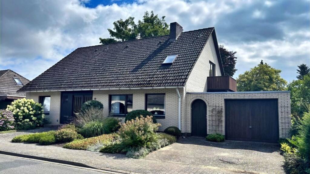 Im Jahr 1974, in beliebter Wohnlage errichtetes und 1986 umgebautes Wohnhaus mit Garage, inklusive eines geschmackvoll angelegten Grundstücks. Über den Eingangsbereich mit seinem vorgelagerten Windfang mit Gäste-WC und Garderobe gelangt man in den großzügigen Wohnbereich. In diesem - recht offen gehaltenen - Teil des Wohnbereichs mit angrenzendem Wohnzimmer und Esszimmer ist - gegenüber einer sehr schmückenden Holzwendeltreppe ins Obergeschoss - eine gemütlichen Kaminecke eingerichtet. Der Kamin hat laut Schornsteinfeger Bestandsschutz und darf bis zu 30-mal im Jahr genutzt werden. Das Wohnzimmer hat, neben einer Doppelflügeltür zum Kaminsitzbereich, eine großzügige Fensterfront nebst Terrassentür für den Zugang auf die Terrasse und den Garten. Auch die Küche (mit Einbauküche, Sitzbereich und anschließender Speisekammer) verfügt über einen eigenen Zugang auf die Terrasse. Im Erdgeschoss sind weiterhin zu finden, ein Bad (mit Wanne und Dusche) sowie ein Gästezimmer. Im Obergeschoss liegen zwei große Schlafzimmer. Das rechte Schlafzimmer mit seinen großzügigen Einbaumöbeln, hat einen Zugang zum Balkon und zu dem - direkt anliegenden - Badezimmer mit Wanne, Dusche und einer Sauna. Der Hauswirtschaftsraum mit Waschmaschinenanschluss und Zugang zu einer Dachabseite - die als Abstellraum genutzt wird - sind vom Flur aus zu erreichen. Die Fenster sind zum größten Teil aus Holz (Mahagoni) und isolierverglast, wobei ein Fenster mit Rollladen ausgestattet ist. Geheizt wird mit einer Ölzentralheizung (Viessmann Niedertemperaturkessel Baujahr 2004). Der Dachboden hat keine Stehhöhe und ist mit Holzdielen ausgelegt, das Dach ist mit einer Betonpfanne und Folie eingedeckt, Zwischen der Garage und dem Haus gibt es einen überdachten Durchgang mit Öllager (4 x 2.000 Liter Kunststofftanks) und Heizraum. Die Übergabe kann zeitnah erfolgen.